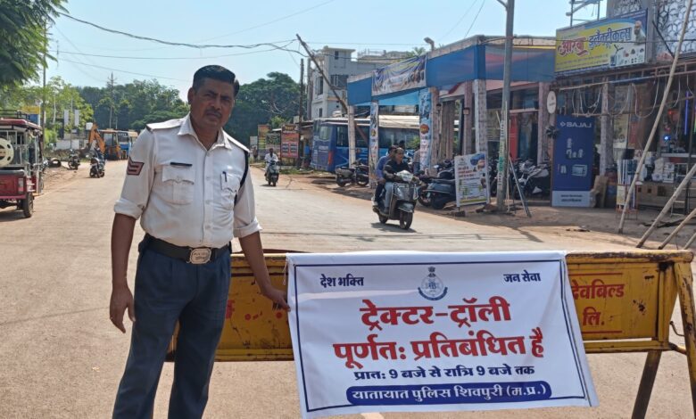 आज यातायात पुलिस द्वारा झांसी तिराहा, पोहरी चौराहा एवं ग्वालियर बायपास पर बैरिकेट्स एवं बैनर लगाकर ट्रैक्टर ट्रॉलियों का प्रवेश शहर के मुख्य क्षेत्र में बंद कर दिया है।