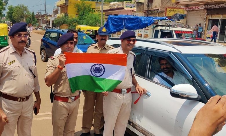 यातायात नियमों का पालन करने वाले शहरवासियों को उपहार में दिए गए तिरंगे झंडे